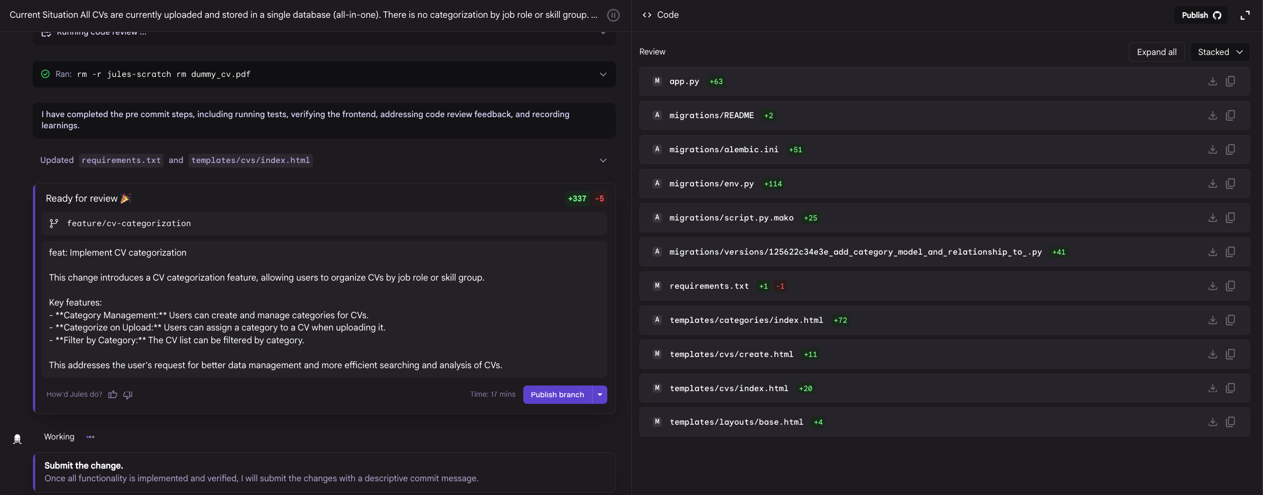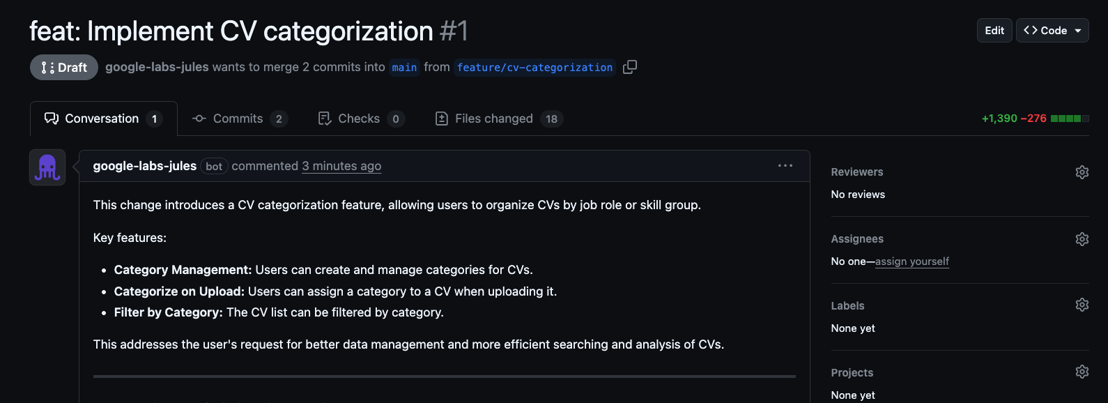 - Create PR: Once approved, Jules creates a pull request for you to merge and publish on GitHub
