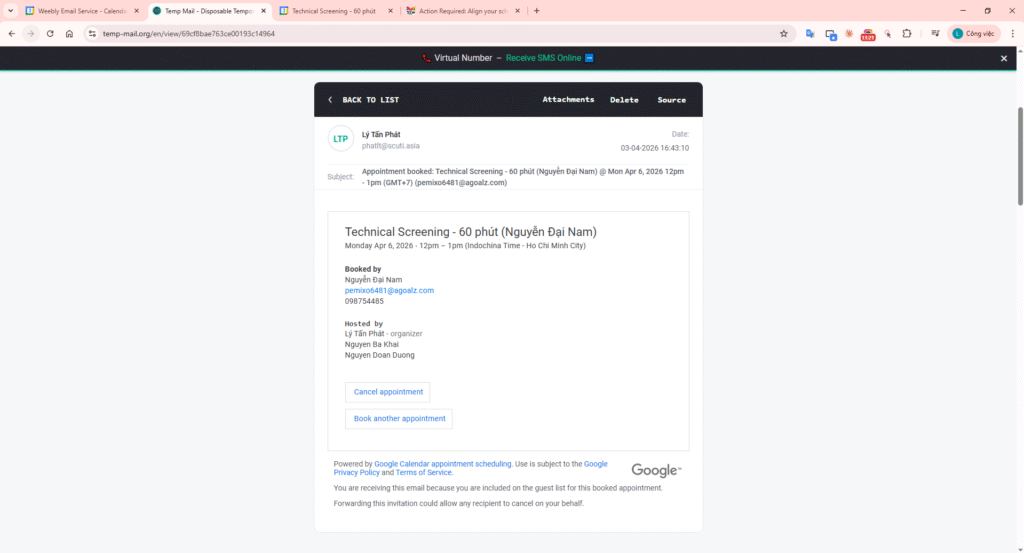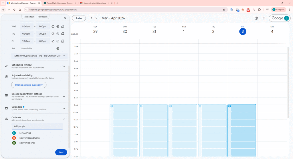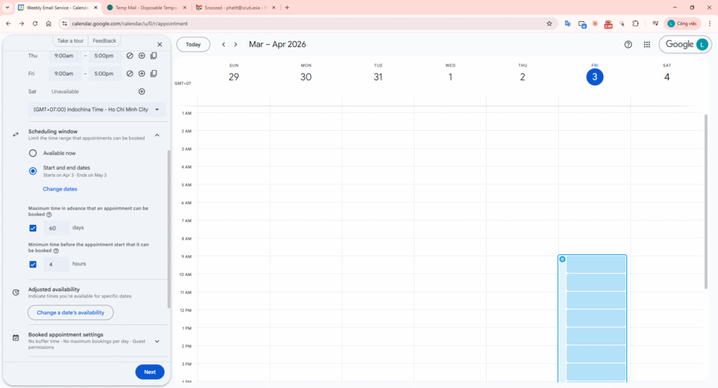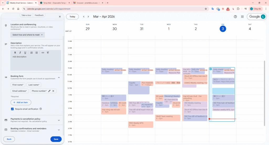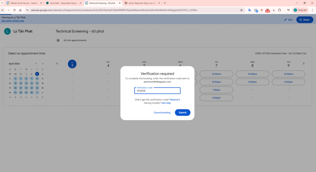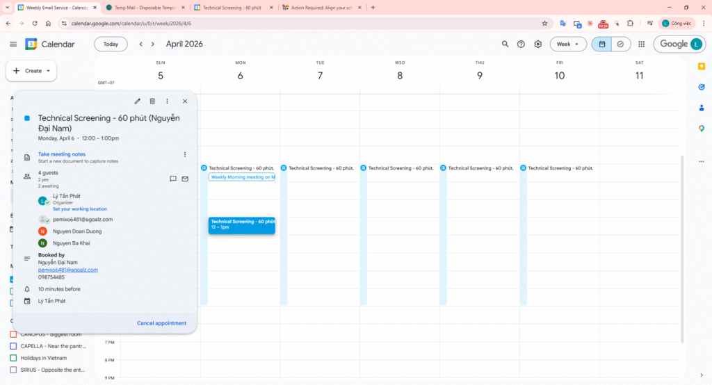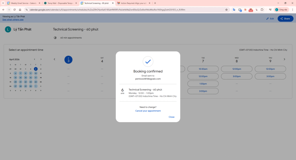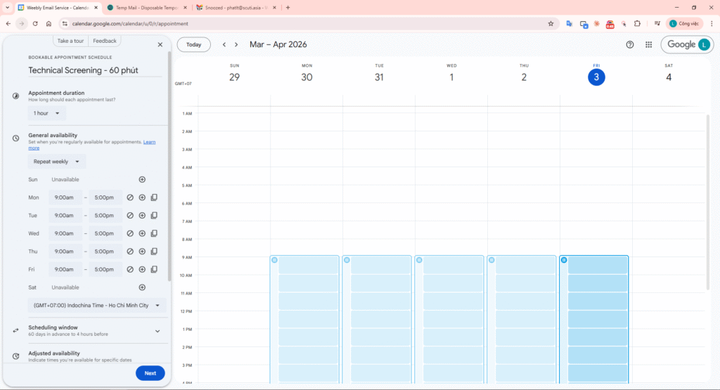 In Google Calendar, use the Create (+) button and select Appointment schedule. Title: “Technical Screening – 60 phút”.