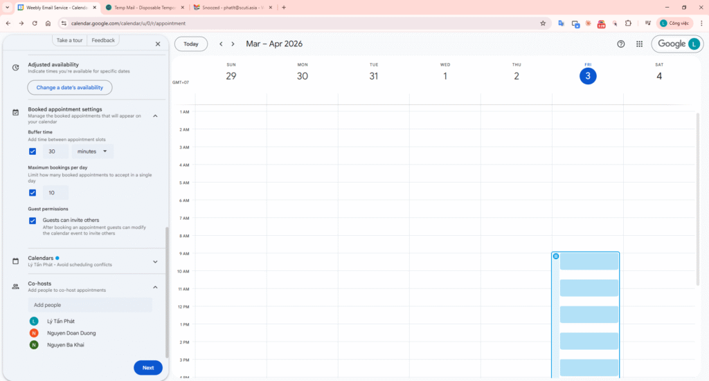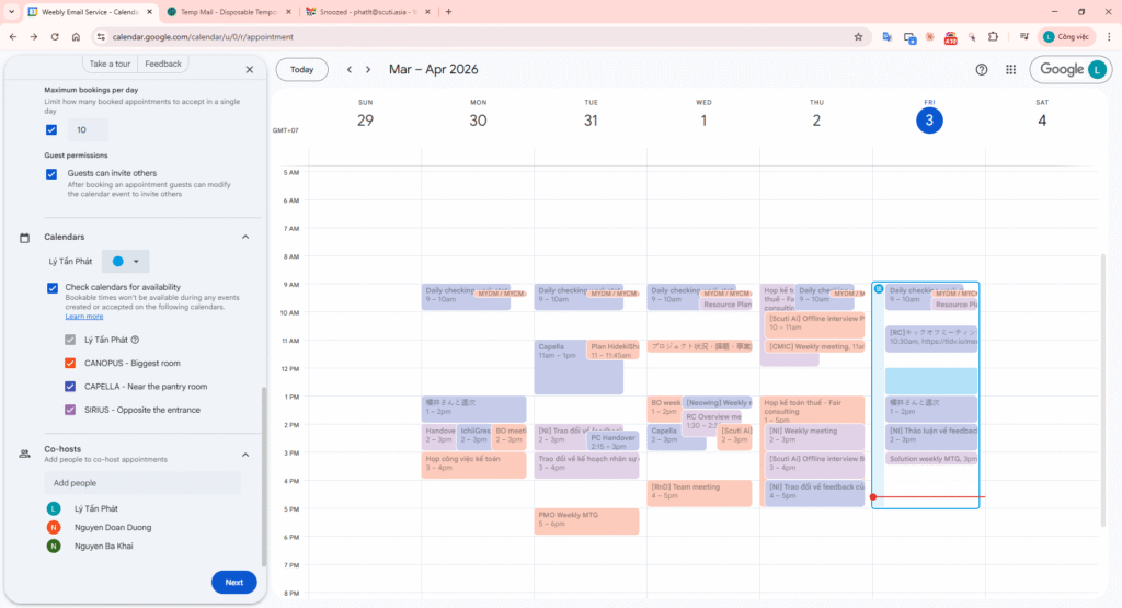 Invite your co-participants under Co-hosts. The system ensures slots only appear when everyone is free.