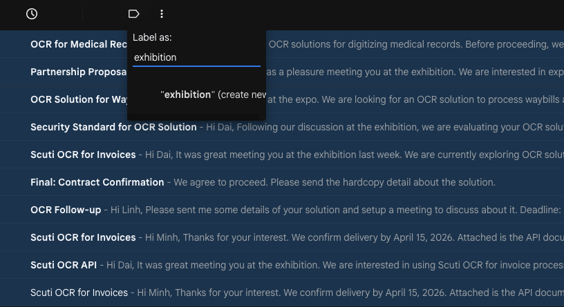Hãy quét tất cả các email trong nhãn "exhibition" và tự động nhận diện từng khách hàng/đối tác riêng biệt.