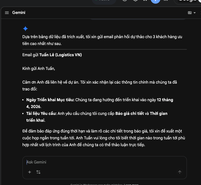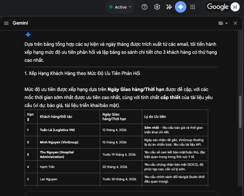 - Nhiệm vụ 2: Gemini tự xếp hạng → bạn biết ngay ai cần phản hồi trước