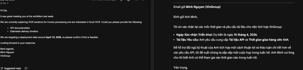 Kết quả kỳ vọng: tiết kiệm ~80% thời gian xử lý email hậu triển lãm, hoàn thành trong 15 phút thay vì cả buổi sáng.